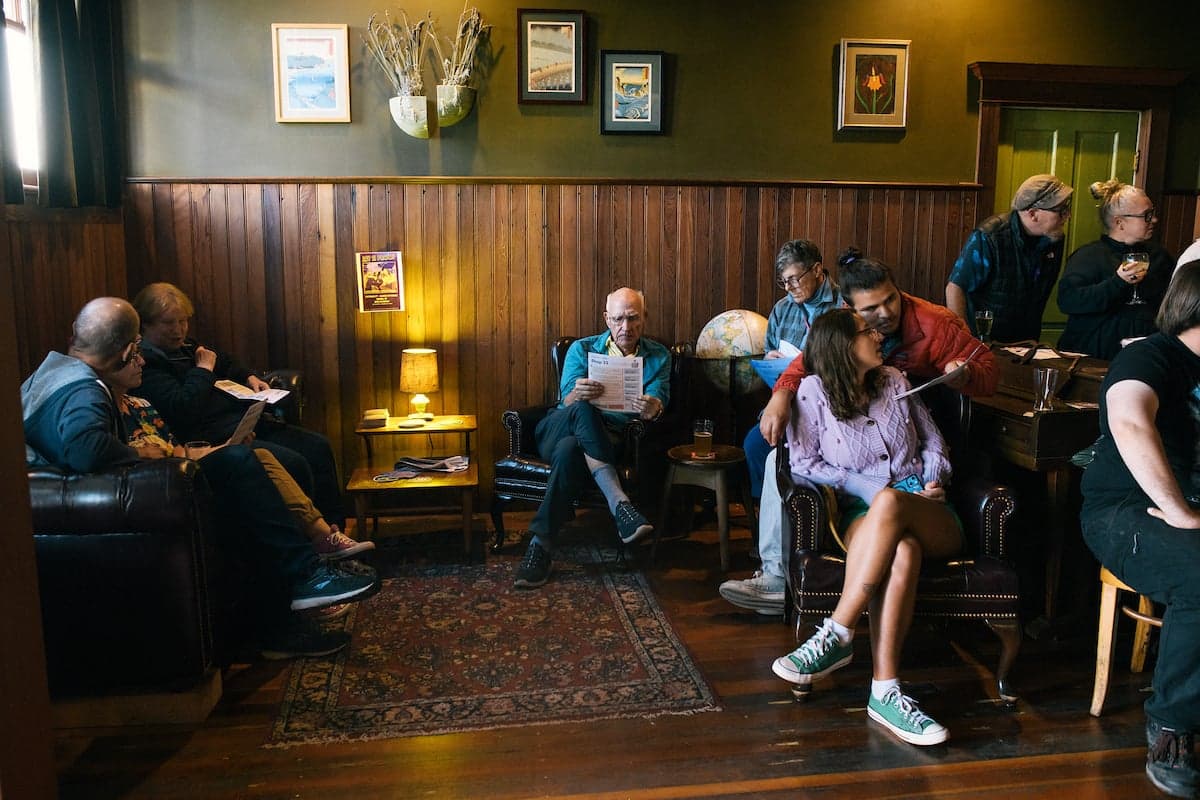 People discuss a ballot proposition in groups at a voter education event hosted by CalMatters and the Lost Coast Outpost at the North of Fourth bar in Eureka on Sept. 12, 2024. Photo by Alexandra Hootnick for CalMatters